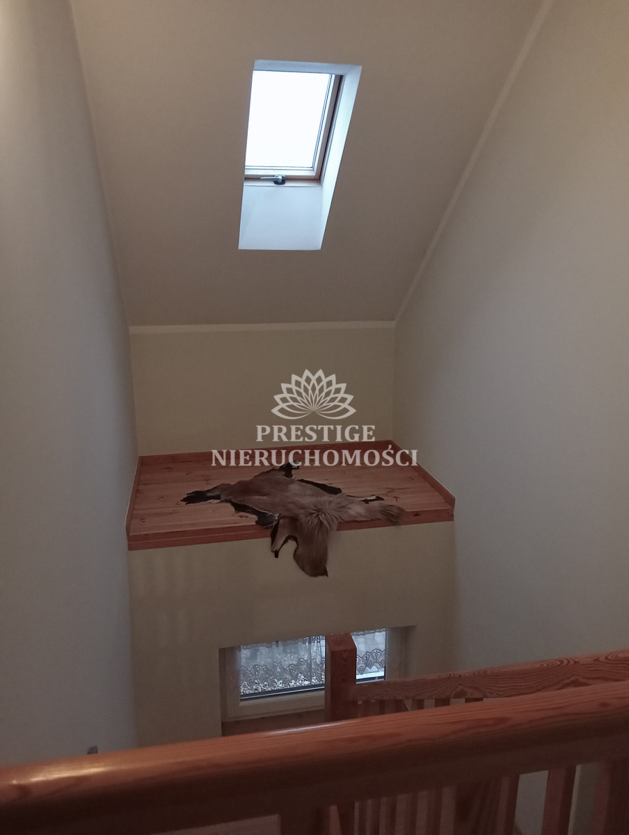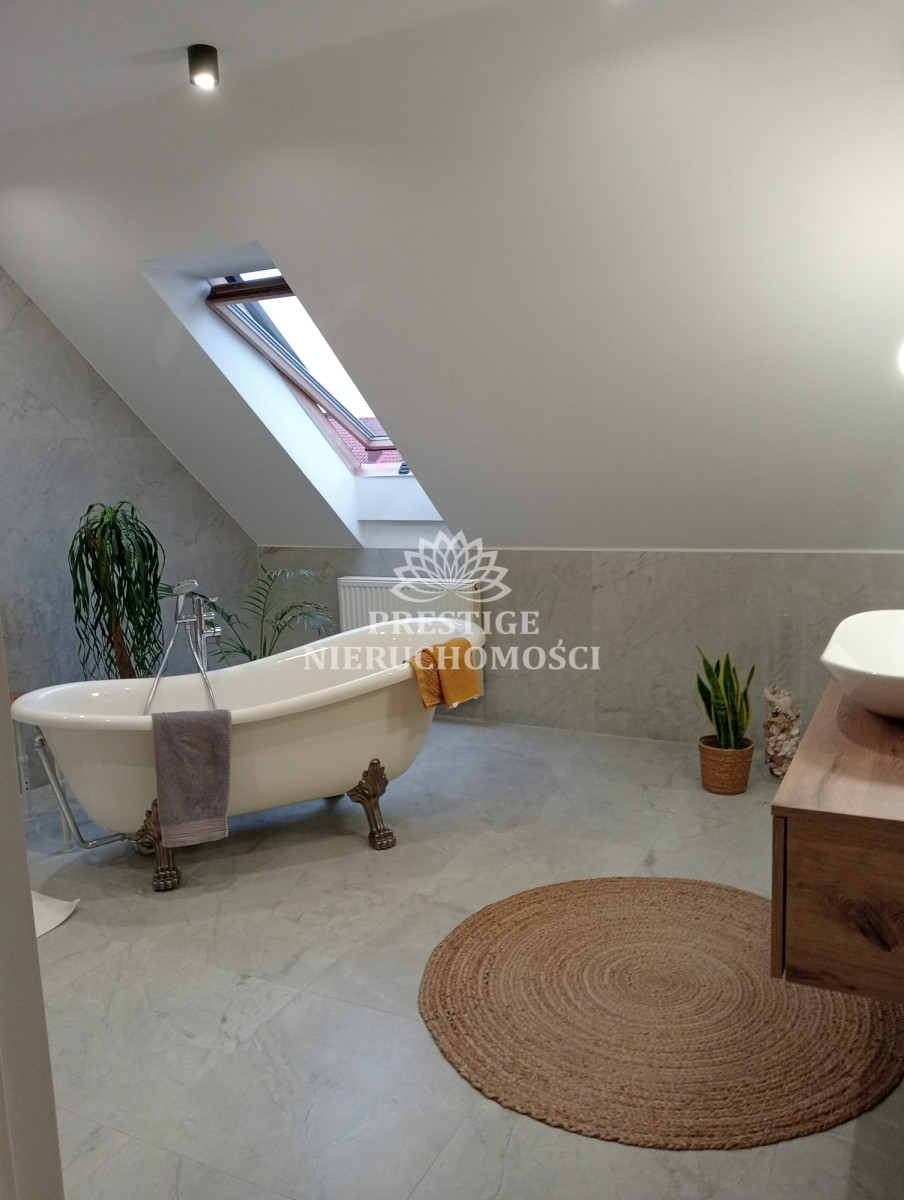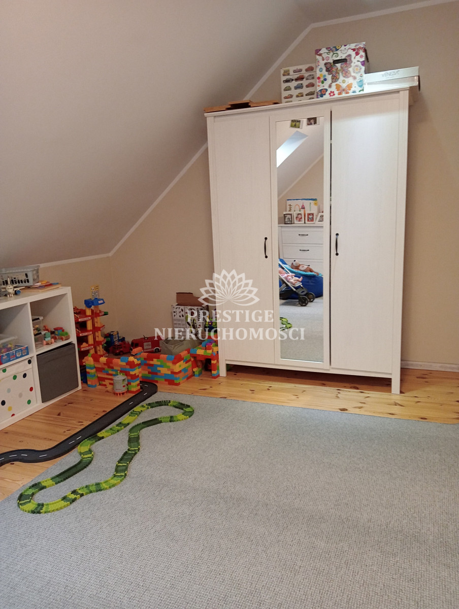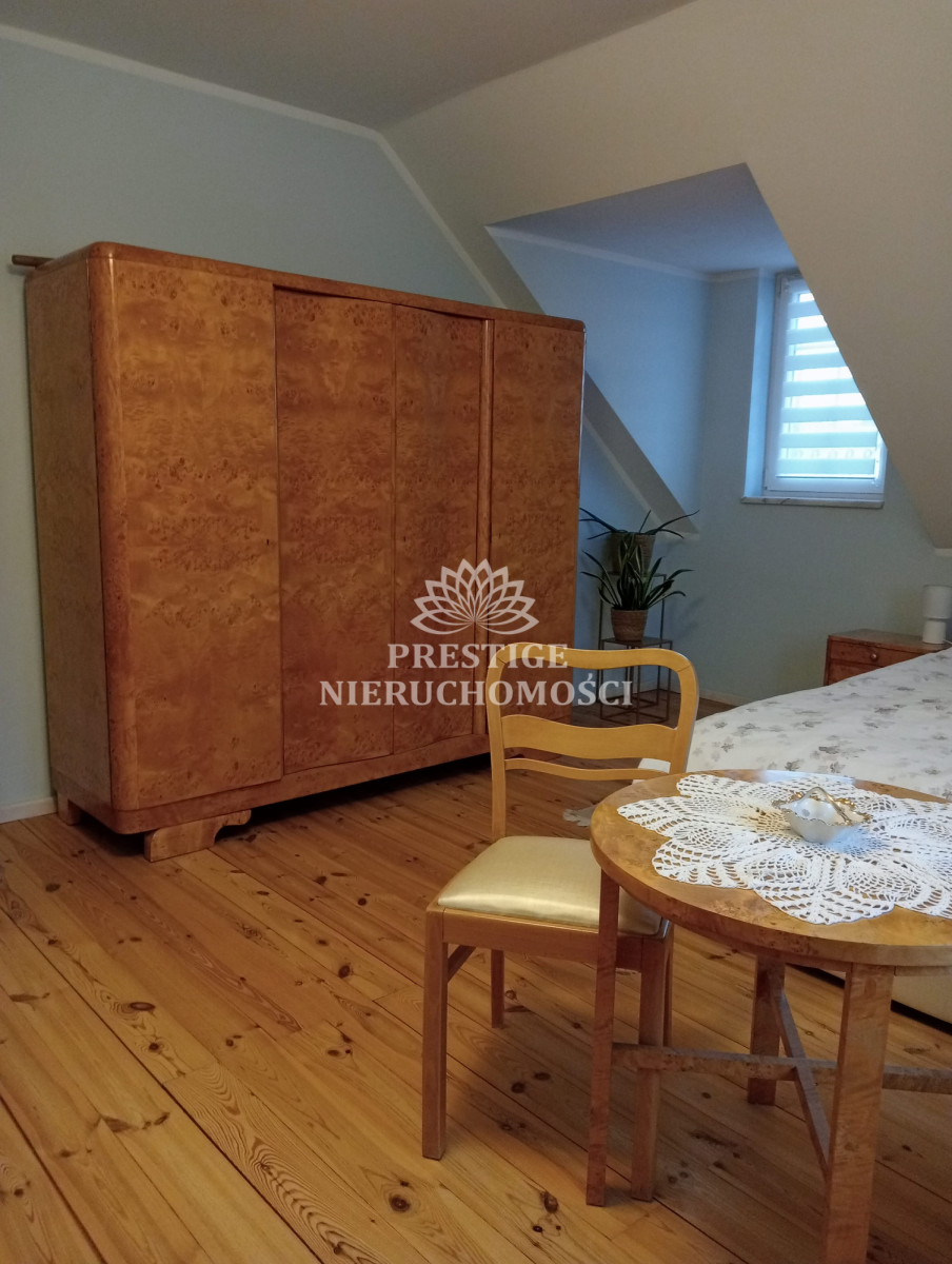 W głównej sypialni właściciele zostawiają przepiękne meble wykonane z czeczotu. Podłogi w pokojach drewniane, sosnowe, w łazience płytki w kolorze jasno-szarym. Strych ocieplony, z podłogą drewnianą i oknem przeznaczony do przechowywania rzeczy sezonowych.