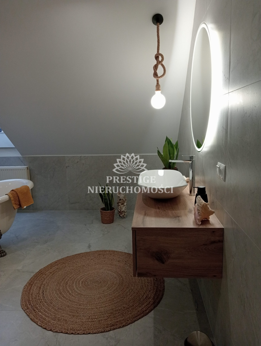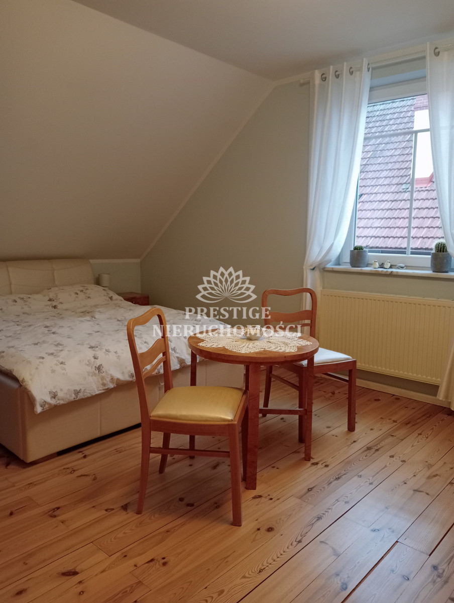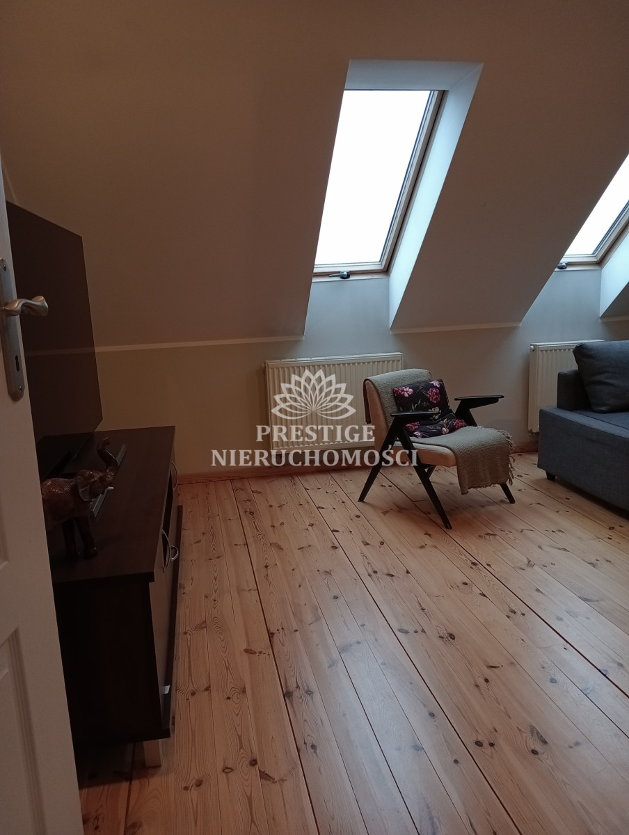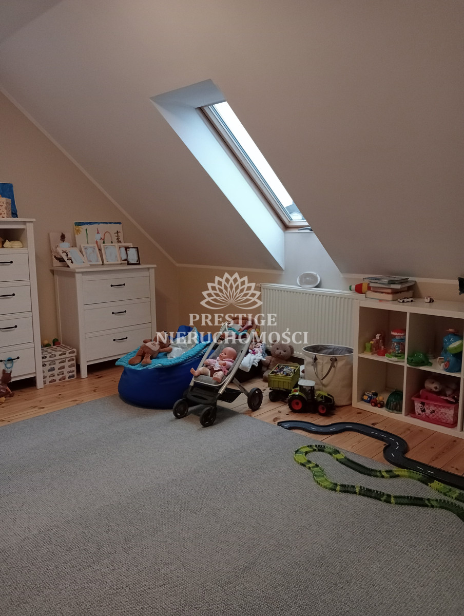W głównej sypialni właściciele zostawiają przepiękne meble wykonane z czeczotu. Podłogi w pokojach drewniane, sosnowe, w łazience płytki w kolorze jasno-szarym. Strych ocieplony, z podłogą drewnianą i oknem przeznaczony do przechowywania rzeczy sezonowych.