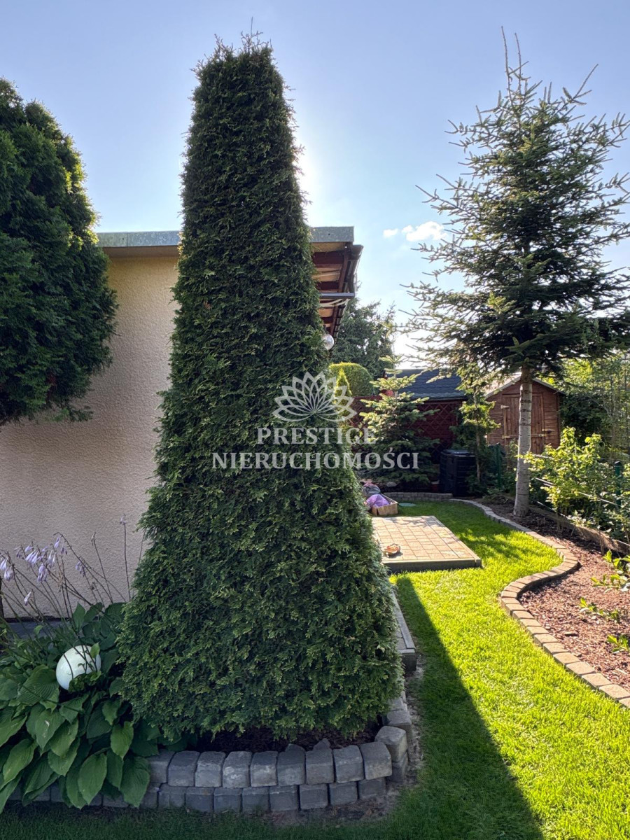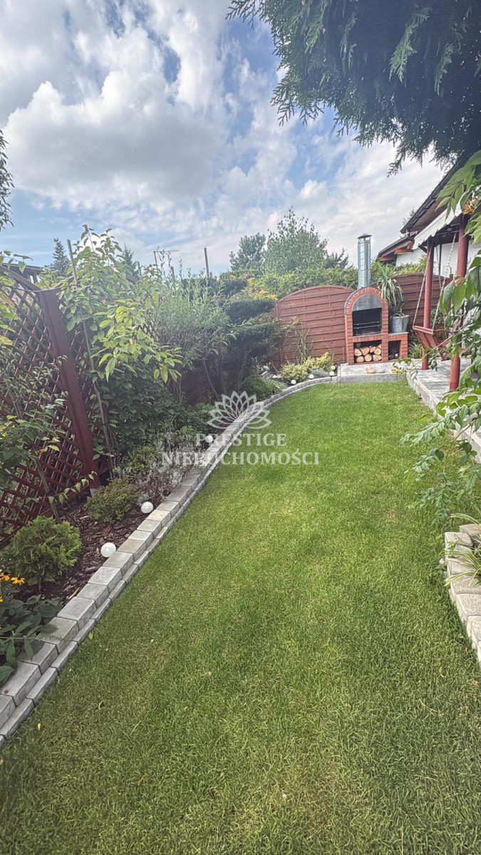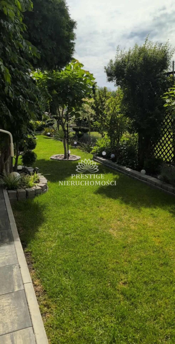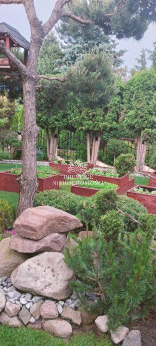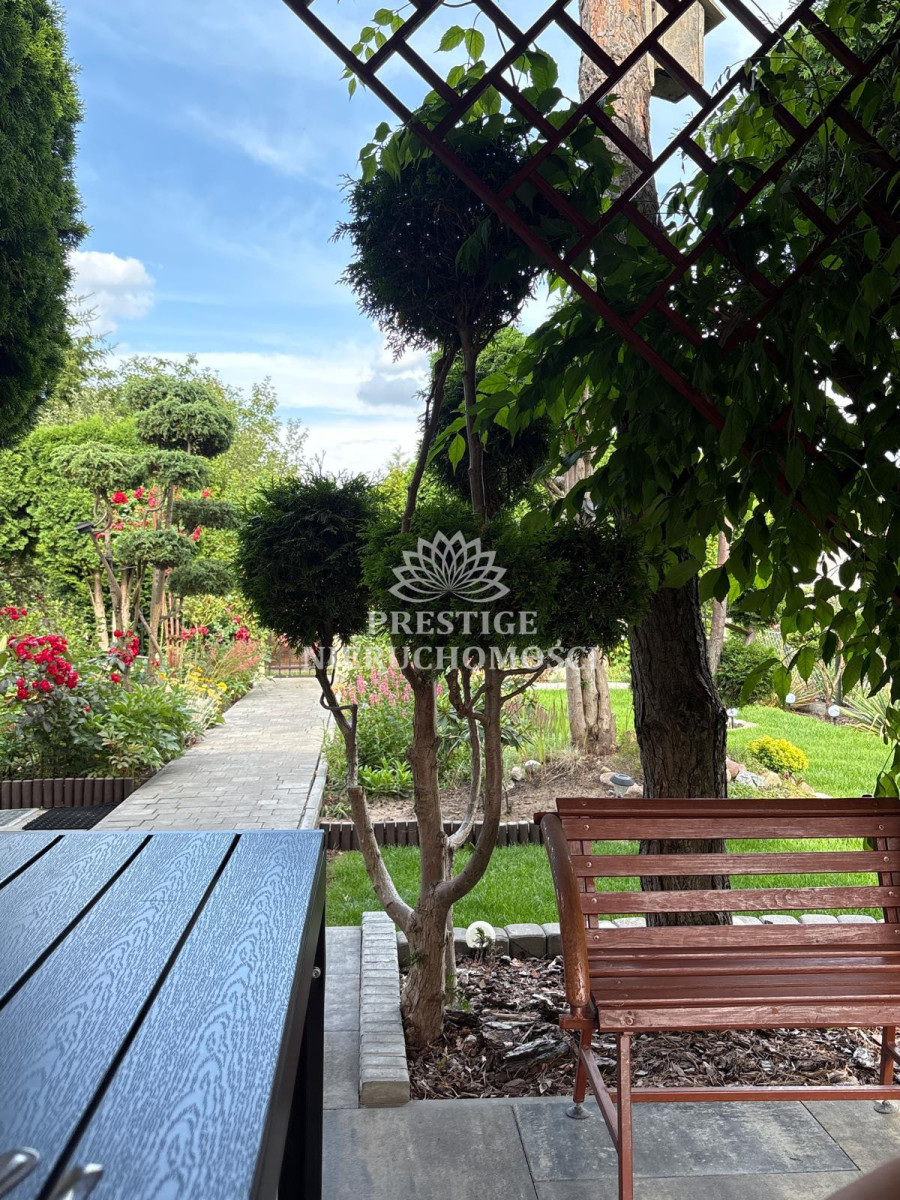Ogród niezwykle malowniczy z licznymi nasadzeniami kwiatów, drzewek iglastych, uformowanych w niezwykłą architekturę zieleni, 2 sterowane fontanny, murowany grill oraz domek drewniany na narzędzia.